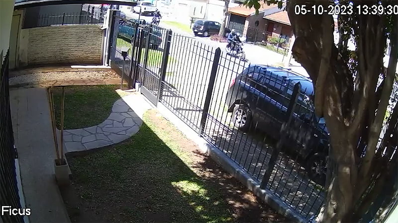 En un video tomado por las cámaras de seguridad de un vecino, al que tuvo acceso la agencia , quedó registrado el momento en el que la víctima estaciona su auto Peugeot frente al registro automotor donde trabaja y, ni bien llega a bajarse, es interceptada por 4 ladrones en 2 motos, que llevaban colocados cascos y camperas oscuras.